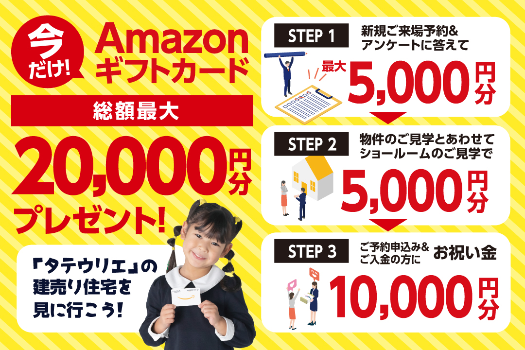 ※ご来場予約特典およびアンケート回答特典は、石友ホームグループ(石友ホーム・ウッドライフホーム・インカムハウス・フレンドリーハウス)の中で1社、お一家族様につき1回限りとさせていただきます。各特典のAmazonギフトカード【ご来場予約特典:2,000円、ご来場前アンケート回答+ご来場後webアンケート回答特典:3,000円】は予約会場に実際にご来場いただいた方を対象とし、後日お渡しいたします。20歳未満の方のみのご来場は対象外とさせていただきます。予約受付時点で建築・リフォーム計画のない方、契約済の方は対象外とします。この特典は【石友ホームグループ】による提供です。お問合せはAmazonではお受けしておりませんので、【石友ホームグループ】まで願いいたします。Amazon、Amazon.co.jpおよびそれらのロゴはAmazon.com,Inc.またはその関連会社の商標です。特典内容は予告なく変更・終了する場合があります。予めご了承ください。